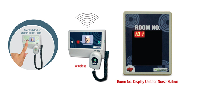 Patient/Attendant presses the 'Call Nurse' button on Remote Call button unit. The patient room number starts to blink on the Room no. display unit along with the sound of beep. Nurse attends the patient and presses the button that switches off the display. This stop the beep as well. In case futher assistance is required by the attending nurse, she presses the emergency button provided on the left side of the Remote Call button unit.